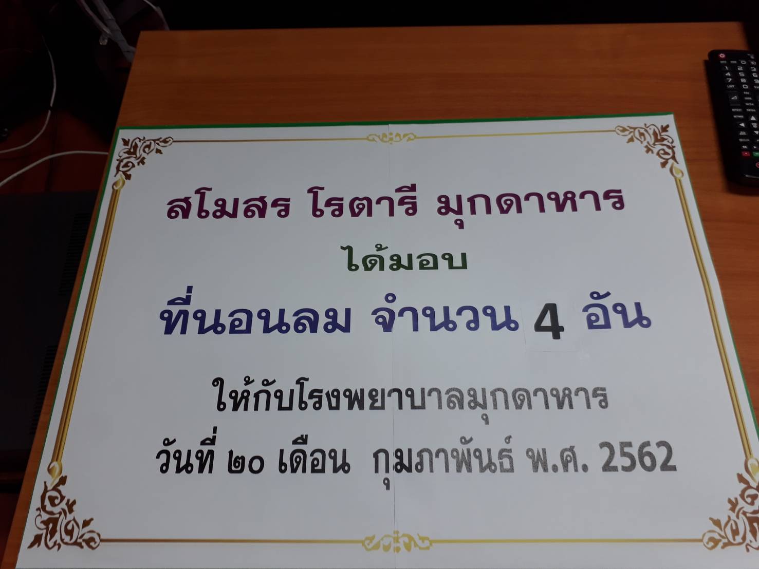 เมื่อวันที่ 20 กุมภาพันธ์ 2562 สโมสรโรตารี มุกดาหาร ได้มอบที่นอนลม ให้แก่โรงพยาบาลมุกดาหาร จำนวน 4 ชุด