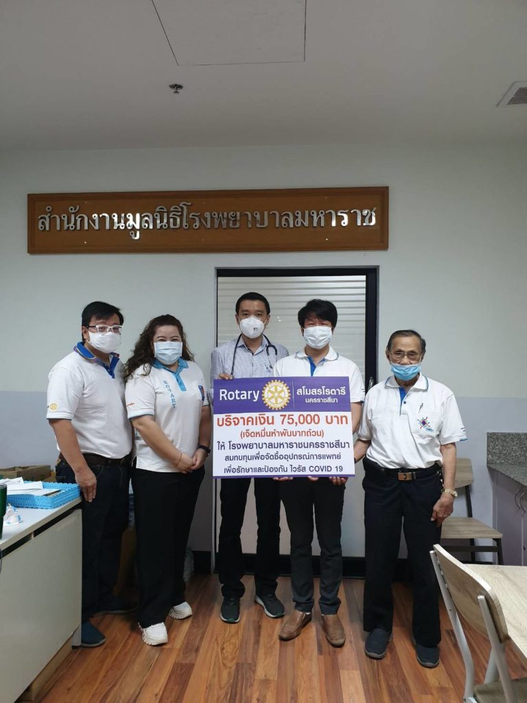 สโมสรโรตารีนครราชสีมา ร่วมบริจาคเงินจำนวน 75,000 บาท เพื่อบริจาคสมทบให้ รพ.มหาราชนครราชสีมา จัดซื้ออุปกรณ์การแพทย์ เพื่อช่วยการป้องกัน บุคลากรทางการแพทย์และรักษาผู้ป่วย covid19 โดยมี นายก ดร.กิตติ วงษ์ชวลิตกุล, อน.ซิม แตมสำราญ ,รทร.วินัย กีรติอุไร และ รทร.อวิกา ปุสุรินทร์คำ เป็นตัวแทนไปมอบเงินบริจาค